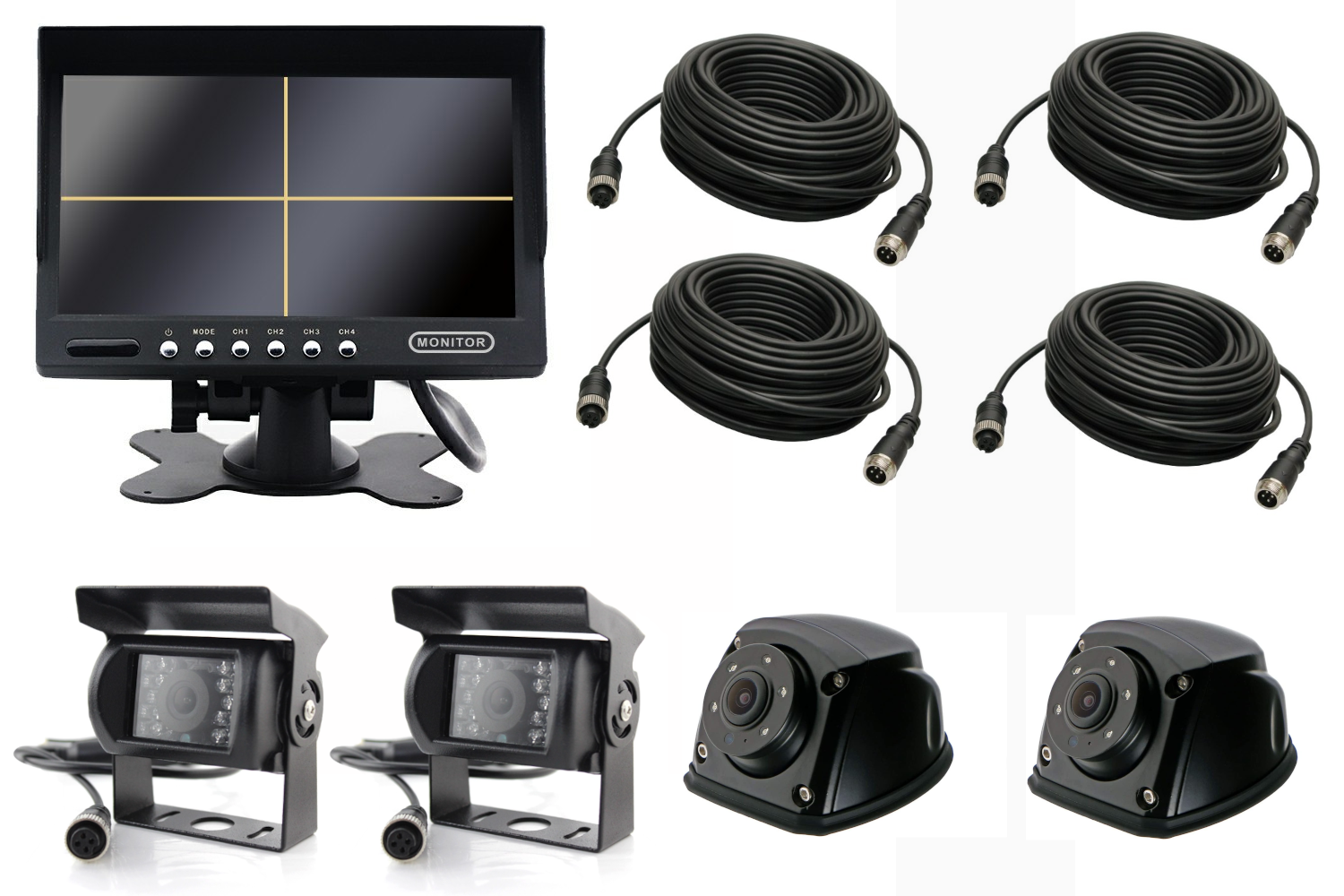 Monitor 7 cali QUAD + 2 kamery cofania + 2 kamery boczne + 2x3m + 10m + 15m