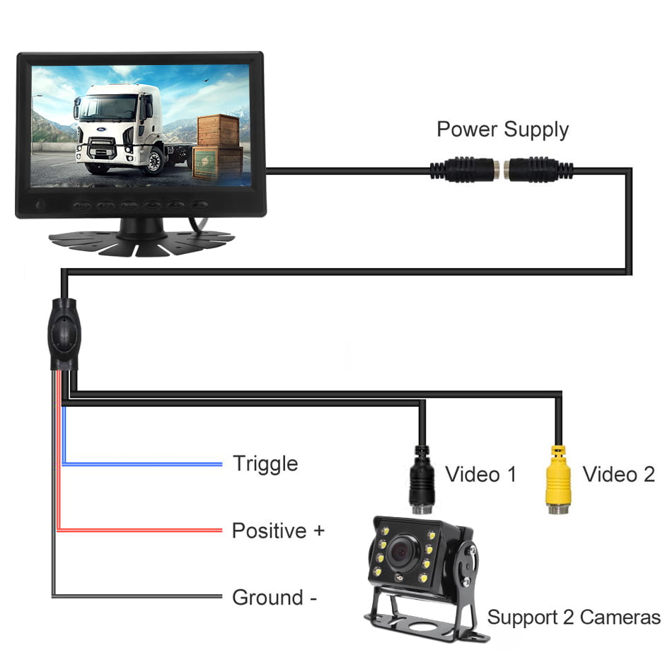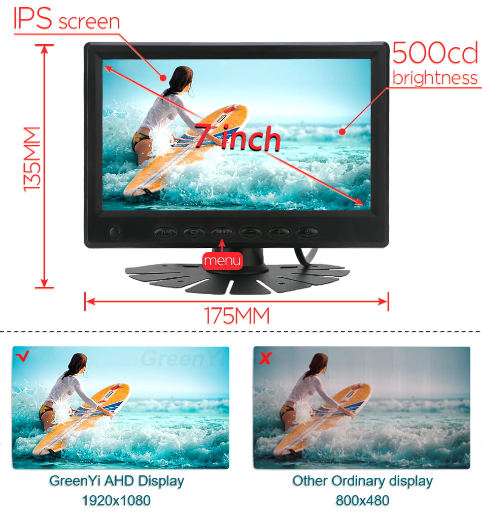 7" kolorowy monitor do kamer cofania AHD. Markowa matryca IPS o wysokiej rozdzielczości HD 1024 x R.G.B x 600.